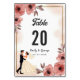 This elegant watercolor floral wedding table number is perfect for a modern wedding. The romantic design features an elegant watercolor floral frame with a bride and groom illustration and black calligraphy on a white background.