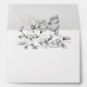Roses. orchids, a peony bud and eucalyptus and greenery leaves, hand-drawn in graphite pencil and layered, make for a modern, sophisticated, elegant and chic wedding envelope that is a modern take on a traditional floral wedding wreath frame. The texture of the black and white pencil shows through the paper, giving it a sense of effortless elegance. The frame is also an updated version of a classic, giving the design structure but keeping a sense of modern freshness. The pearl coloured background on the back gives a very subtle spot of colour that supports that very fine gold thread running through the frame and some of the greenery. A QR code template is available on the back.