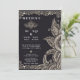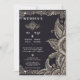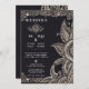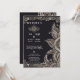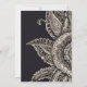 This captivating wedding invitation design features a rich black canvas, beautifully contrasted by ornate, lace-like golden embellishments. The borders are adorned with intricately woven floral and vine patterns, creating a luxurious frame that exudes elegance and sophistication. On the right, a grand display of layered petals and swirling leaves draws attention with its fine details and artistic depth. At the centre, a delicate floral emblem radiates charm, perfectly balancing the intricate border work. This design embodies timeless romance and opulence, making it ideal for a wedding celebration filled with grace and grandeur.