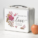 An elegant lunch box featuring a floral design with cute small birds and a script love text. Beautiful for school or office.