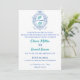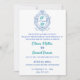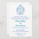 This wedding invitation showcases an elegant blue line art design featuring an ornate oval frame adorned with floral motifs, ribbons, and bows. The intricate details create a vintage and refined look on a white background, perfect for a traditional or formal wedding theme.