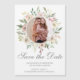 An elegant circle frame of watercolor blush pink peonies and ivory cream roses frame this lovely summer Save the Date photo magnet. The botanical sprigs of sage green eucalyptus leaves decorate in the midst of the peach array of flowers above the beautiful cursive script. These delicate pastel magnetic cards are perfect for a garden ceremony with an outdoor reception. Add your own engagement photograph