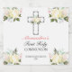 Celebrate your daughter's First Holy Communion with friends and family and offer them champagne or sparkling wine with this pretty white floral rose and cross 1st Holy Communion champagne label. This champagne labels for first holy communion feature a beautiful cross with a floral frame against a simple white background.