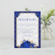 Provide important details about your wedding reception, with this elegant invitation enclosure card, featuring gold jewelled filigree framing soft white satin, crowned with blue roses. The simulated royal blue metallic background enhances the luxurious feeling.