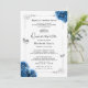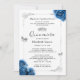 Create your own unique, personalised photo invitations using an editable DIY template that effortlessly accommodates a custom picture and party event details. Created with original art Raphaela Wilson, the elegant design boasts a beautiful blend of faux metallic silver butterfly confetti, a regal princess crown / tiara, and delicate royal blue watercolor roses, adding a floral fairy tale touch. Enhancing the princess design, a vintage gown dress border imparts additional charm on both sides, while the reverse side of the card features an enchanting botanical pattern of blue roses. Further customisation options enable you to tailor this whimsical fairytale invitation template to your preferences. Modify the typography style, transitioning from the displayed calligraphy script and modern fonts to better suit your fancy. These elegant DIY template invitation cards, perfect for a luxurious quinceañera, also lend themselves beautifully to a royal blue sweet 16 birthday party, rose-themed weddings, a once upon a time bridal shower, Cinderella baby shower, and other occasions where a captivating silver and blue party theme is desired. Whether your celebration takes place in winter, summer, autumn/fall, or spring, these elegant photo quinceañera invitations can elevate your Big Day with a touch of sparkle and elegance. Enjoy! Category: Mis Quince Anos template quinceanera invitations with photo; royal blue and silver wedding invitations; and blue sweet 16 invitations for daughter / her. Royal blue quince party theme colours: dark blue, medium blue navy, sapphire, light grey, dark grey, silver, black and white.