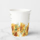 Vibrant yellow sunflower floral blooms bouquet border with greenery foliage making elegant boho chic spring summer fall garden baby shower personalised paper cups with whimsical elegant modern hand lettered sage green calligraphy script over a white background.