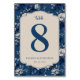 This is a vintage style image featuring an elegant table number card with the number "8" prominently displayed in navy blue. The background is adorned with intricate floral patterns in shades of dark blue and white, creating a sophisticated and romantic ambiance. Perfect for adding a touch of classic charm to your wedding or formal event decor, this design evokes feelings of timeless elegance and grace.