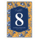 This is a vintage style image featuring an elegant table number card, perfect for a wedding or formal event. The deep navy blue background contrasts beautifully with the vibrant orange floral pattern surrounding it, creating a sophisticated and inviting atmosphere. The large white "8" stands out prominently, while the names "Lauren & Benjamin" and the date "May 23, 2026" add a personal touch. It's ideal for setting a romantic and stylish tone at your special occasion.