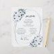 These light and airy 8.5" x 11" elegant vintage formal dinner paper sheet menus feature dark teal and mint floral design with teal lettering on a chiffon white background with the header, "Menu," and placeholders for 2 appetizers, 2 entrees, 2 sides and 2 desserts.