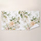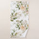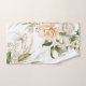 Elegant floral towels with soft, pastel flowers and green leaves displayed on a light wall. One is hung, the other folded, creating a tranquil vibe.