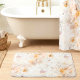 This gorgeous bath mat has a color palette that is a perfect blend of warm neutrals and earthy pastels that include creamy ivory, warm amber, muted apricot, dusty lavender, and soft champagne. Soft-focused watercolor blooms have a sun-drenched quality that feels vintage and airy. This gives it a kind of Chic, Cottagecore interpretation of nature and the ability to compliment or be the anchor for any number of bathroom design aesthetics!