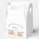 This soft and romantic favour box features delicate watercolor florals in blush pink, peach, and greenery on a white background. A timeless design, perfect for spring weddings, garden receptions, or bridal showers.