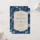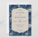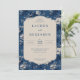 This is a vintage style image featuring an elegant wedding invitation set against a rich blue floral background. The intricate white flowers and leaves create a sophisticated, romantic atmosphere. The central cream-colored panel displays the names "Lauren and Benjamin" in bold, with details of their special day—May 23, 2026, at Willowbrook Estate in Atlanta, Georgia. It exudes timeless charm and grace, perfect for setting the tone for a classic and memorable celebration.