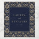 This is a classic style image featuring an elegant wedding invitation with intricate floral patterns in gold and navy blue. The central dark blue panel showcases the names "Lauren and Benjamin" along with their special date, May 23, 2026, in sophisticated white script. The surrounding ornate floral design adds a touch of timeless elegance and luxury, making it perfect for setting the tone for a grand celebration. It evokes feelings of romance and sophistication, ideal for those seeking a traditional yet stylish wedding theme.