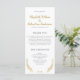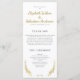 Elegant wedding program with a script text in golden yellow and black modern font text on white background. The program is decorated with a gold flourish ornament. Personalise this template with your data.