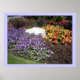 A wonderful garden of flowers in purple and orange and yellows. A large rock in the centre of the garden. A border of mauve and deep purple accent it.
