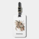 A luggage tag with a pretty bouquet of peach florals, surrounded by brownish bronze grasses and foliage with feather accents.