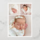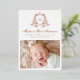 Celebrate your baby’s arrival with this elegant rose gold foil birth announcement card. The front features your baby’s monogram initial framed by a stunning rose gold foil floral crest on a white background. Your little one’s full name shines in coordinating rose gold foil calligraphy, with space below for birth stats, family name, and a horizontal newborn photo. The back showcases a matching three-photo collage, perfect for sharing more of your baby’s precious moments. Personalise with your baby’s details to create a luxurious keepsake for family and friends.