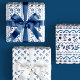 This elegant wrapping paper set features folk inspired watercolor illustrations in cobalt blue over a white background.
