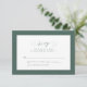 With classic and elegant typography, this RSVP card features a frame in a stylish shade of sage green. It sets the tone for a timeless, elegant wedding with its formal wording and type. It's designed to coordinate with Lea Delaveris Design's Simple Elegant wedding collection. Frame and background colour are editable by clicking "Customise further."