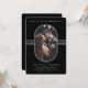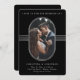 These elegant wedding invitations feature a rounded silver frame surrounding your personal photo, with matching geometric lines and modern text on a dark, black background. A minimalist and stylish design.