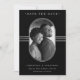 These elegant save the date cards feature a rounded silver frame surrounding your personal photo, with matching geometric lines and modern text on a black background.