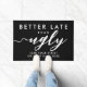 Greet your guests with humour and style using this Funny Welcome Doormat. Featuring a modern white handscript font on an elegant black background, the playful message "Better Late Than Ugly" adds a fun twist to any entryway. This customisable doormat allows you to personalise it with your own text, such as your address or any message you'd like to display. Perfect for adding a unique, welcoming touch to your home decor while creating a friendly atmosphere. A practical and stylish way to greet visitors, this personalised welcome mat is an ideal gift for housewarmings or any occasion.