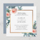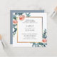 Elegant golden frame adorned with beautiful watercolor eucalyptus and pink garden roses, wedding invitation. Back of card features solid dusty blue colour. Customise text, font style, colour and size.