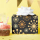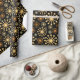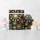 Elegant geometric pattern wrapping paper in black and gold which gives a luxurious feel to any gift. The design features a mid-century starburst pattern on a black background with gold star shapes or snowflake motif. This design style is popular and often described as retro or celestial. This elegant and modern gift wrap is suitable for birthdays, festive holidays, and other special occasions.