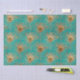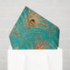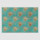 An elegant tissue paper pattern of gold glitter peacock feathers on aqua background