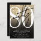 Gold Glitter 80th Birthday Party Invitation. Celebrate eighty in style with this bold and chic design. The top half features a large white “80” with a sassy handwritten black script “Eighty” layered over it, standing out against a faux gold glitter background that fades into a sleek black gradient. The bottom portion is solid black with party details in a clean white sans serif font for a modern, striking look.