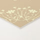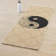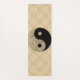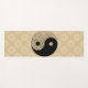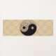 A mystical yin yang symbol super imposed on top of a decorative, round gold rosette gives an added dimension of mystery. The backdrop is a repeat pattern of golden floral wreaths on a beige back round. Elegant meditative vibes