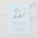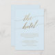 This elegant gold and blue calligraphy hotel enclosure card is perfect for a simple wedding. The neutral design features a minimalist card decorated with romantic and whimsical faux gold foil typography.