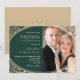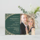 Luxury, modern, deco, elegant emerald green wedding invitation with vintage gold frame and photo of bride and groom.