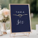 Simple, minimalist, elegant navy blue wedding table number with gold rope heart and modern calligraphy script.
