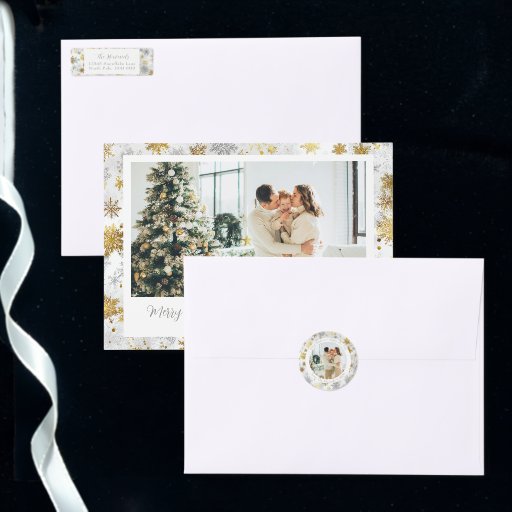 Celebrate the holiday season with this elegant gold and silver snowflake Christmas post card, designed to showcase your favorite family photo in a festive and stylish way. The shimmering snowflake border adds a touch of sparkle while keeping the focus on your personal picture. Perfect for sending warm wishes to friends and family, this postcard is ideal for both Christmas and New Year greetings. Personalize easily with your own text and photo to create a keepsake that loved ones will treasure for years. A modern yet timeless design for holiday mailings this year and beyond.