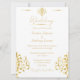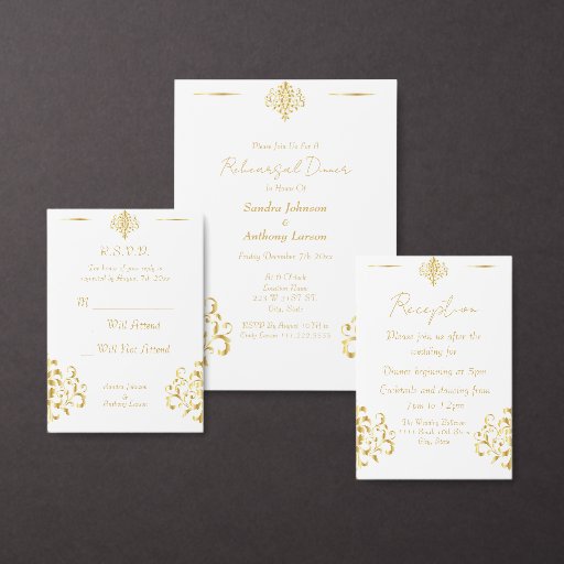 A gold and white damask wedding invitation featuring a classic, elegant design with intricate gold damask patterns on a white background, accented with gold for a luxurious, formal feel. These invitations are ideal for upscale or traditional weddings, setting a tone of grandeur and sophistication. This invitation is part of a set.
