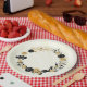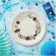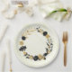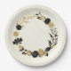 Elegant black and gold flowers with some leaves against white and gold marble background paper plate.