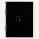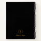 Elegant gold monogram personalised spiral notebook. Front centre - small formal gold text monogram within a square border, black background. Back bottom - small formal gold text monogram within a square border and script text name beneath, black background.