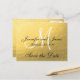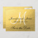 Elegant Gold Black Save the Date postcard. Elke Clarke© for MonogramGallery at Zazzle. Modern, simple wedding announcement with printed gold foil photo effect. A white monogram initial in script typography with black text overlay. Fully customisable. Other colours and background effects available.