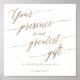 This elegant gold calligraphy your presence is our greatest gift poster is perfect for a simple wedding. The neutral design features a minimalist card decorated with romantic and whimsical faux gold foil typography.