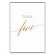 This elegant gold calligraphy table five table number is perfect for a simple wedding. The neutral design features a minimalist card decorated with romantic and whimsical faux gold foil typography. The card prints on the front and back (double-sided). Other table numbers in the collection are sold separately.