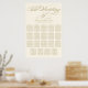 Elegant black calligraphy script wedding seating chart poster design features a monogram of the bride and groom names and wedding date and custom template text for nineteen (19) table numbers and guest names. Colours include ivory and champagne gold.