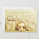 Elegant gold Corporate Christmas card with gold Season's Greetings script on a festive gold background. This beautiful gift and ornament gold corporate Christmas card is easily customised by simply adding your message and logo in the font style and colour of your choice.