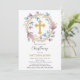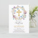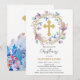 © 2023 Socialite Designs & LICENCORS. Beautiful christening or baptism invitation with a gold cross, gold and floral frame. A wonderful invitation to invite family and friends to attend the event and gathering afterwards.