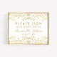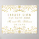Guide guests to your guest book table with this ornate gold damask "Please Sign Our Guest Book" sign. Elegant glittering damask filigree borders frame the top and bottom in a landscape orientation, with space for the couple's name and wedding date in refined gold typography. Coordinates with the full gold damask sign collection. All text is fully customizable.