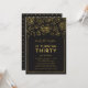 Elegant Floral 30th Birthday Party invitation featuring faux gold foil floral and border against a dark grey background on the front. Invitation has a faux gold polka dot pattern against a dark grey background back side.