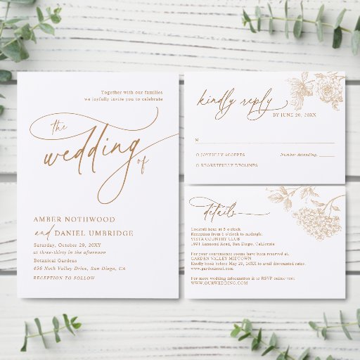 Elegant Gold Floral Simple Black & White Wedding Invitation