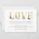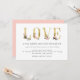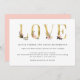 This elegant wedding invitation features the word "love" in faux gold text with watercolor look blush pink and gold flowers, for a modern and dramatic look.
