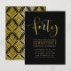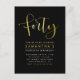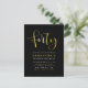This formal, elegant, trendy, modern fortieth birthday party invitation is suitable for men or women. It features a stylish "Forty" script and simple typography on a black background. On the reverse, there is a faux gold foil art deco pattern.